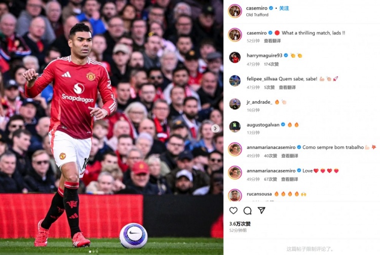 3月10日訊 曼聯(lián)在本輪英超焦點戰(zhàn)主場1-1戰(zhàn)平阿森納,卡塞米羅在本場比賽表現(xiàn)搶眼。數(shù)據(jù)統(tǒng)計顯示,他在本場16次對抗12次成功,還貢獻了2次解圍、2次封堵和9次搶斷。卡塞米羅也在賽后通過社媒曬出自己的比賽照,并感嘆:“小伙子們,多么激動人心的一場比賽!”馬奎爾也現(xiàn)身評論區(qū)并留下代表鼓勵的鼓掌表情????????。 本文標簽: 足球 英超 曼聯(lián) 阿森納