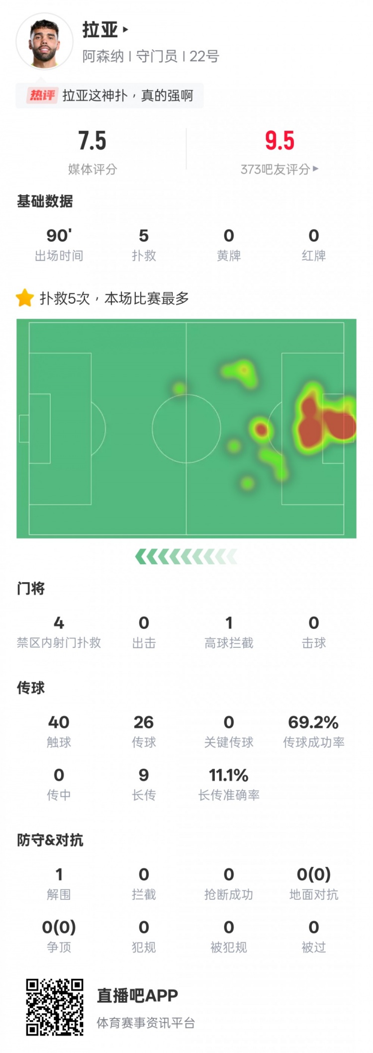 3月10日訊 英超第28輪,阿森納1-1曼聯(lián),拉亞首發(fā)出戰(zhàn),貢獻全場最多的5次撲救,其中有4次是撲救對手禁區(qū)內(nèi)的射門,他還有1次高球攔截,評分7.5。拉亞本場比賽數(shù)據(jù)如下:撲救5禁區(qū)內(nèi)射門撲救4高球攔截1觸球40傳球26傳球成功率69.2%長傳9長傳準確率11.1%解圍1 本文標簽: 足球 英超 阿森納