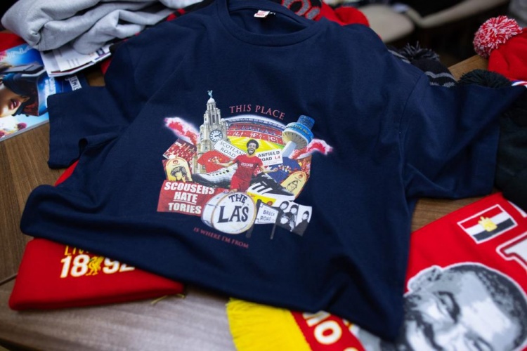 在距離利物浦主場安菲爾德只有5分鐘步行路程的一家商店里,你可以看到當(dāng)?shù)卣诔鍪垡患?0鎊的T恤,上面印有目前利物浦這座城市的標(biāo)志:樂隊(duì)披頭士和The La's、地標(biāo)性建筑皇家利物大廈和利物浦電臺(tái)城塔,以及薩拉赫。