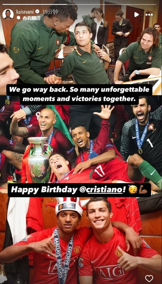2月5日訊 今天是C羅的40歲生日,38歲的納尼更新動(dòng)態(tài),送上了祝福。納尼表示道:“回顧過去,我們一起有很多難忘的瞬間和勝利時(shí)刻。生日快樂,C羅?!?/p>納尼和C羅在葡萄牙隊(duì)和曼聯(lián)當(dāng)過多年隊(duì)友,一起贏得過歐冠冠軍、歐洲杯冠軍在內(nèi)的多項(xiàng)冠軍。 本文標(biāo)簽: 足球 C羅 英超 曼聯(lián) 葡萄牙