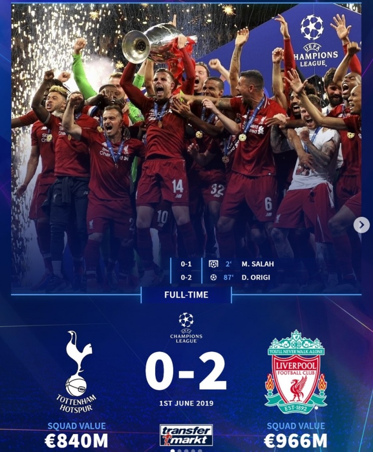 2019年6月,歐冠決賽:熱刺0-2利物浦,此前長期受傷的凱恩火線復(fù)出表現(xiàn)不佳,薩拉赫開場閃擊、奧里吉鎖定勝局。