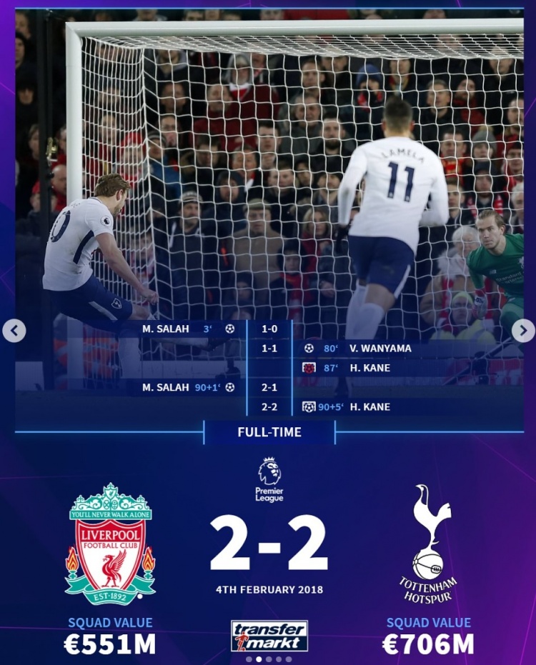 2018年2月,英超:利物浦主場2-2熱刺。薩拉赫開場閃擊,萬亞馬替補世界波扳平,凱恩第87分鐘失點,薩拉赫第91分鐘“絕殺”,凱恩第95分鐘再次主罰點球完成絕平。