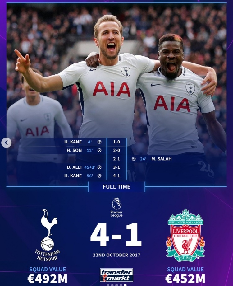 2017年10月,英超:熱刺主場4-1利物浦。孫凱上半場各進一球,薩拉赫扳回一城,阿里上半場補時破門,凱恩下半場再進一球鎖定勝局。