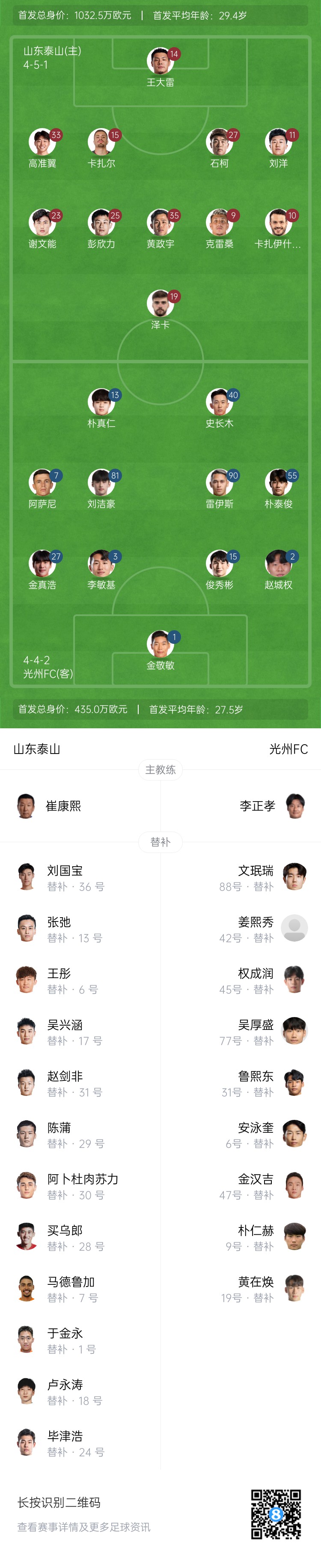 山東泰山首發(fā):14-王大雷、11-劉洋、15-卡扎爾(F)、27-石柯、33-高準(zhǔn)翼、25-彭欣力、35-黃政宇、23-謝文能、10-卡扎伊什維利(F)、9-克雷桑(F)、19-澤卡(F)